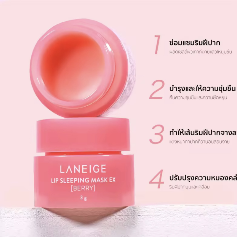 Special care using Laneige Lip Sleeping Mask! Vitamin C-rich Berry Mix ComplexTM, containing raspberry, strawberry, cranberry, and blueberry extracts erases dry, flaky dead skin on the lips during the night to realize smooth and supple lips the next morning.