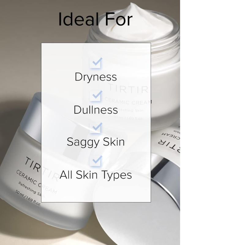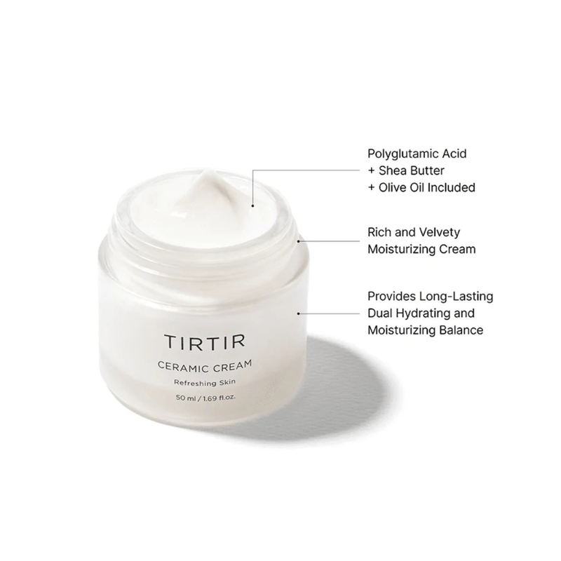 lndulge your skin in the luxurious hydration of TIRITIR Ceramic Cream. Formulated with a potent blend of Polyglutamic Acid and Shea Butter, this cream delivers deep and long-lasting nourishment, leaving your complexion supple, smooth, and radiant. Enriched with Hamamelis Virginiana Extract, it works to minimize the appearance of pores while providing a soothing finish, promoting a refined and even skin texture. With its rich texture that spreads smoothly, TIRTIR Ceramic Cream creates a protective moisture barrier over dry skin, locking in essential hydration for a revitalized complexion. However, it’s important to note that this cream is not recommended for oily skin types.